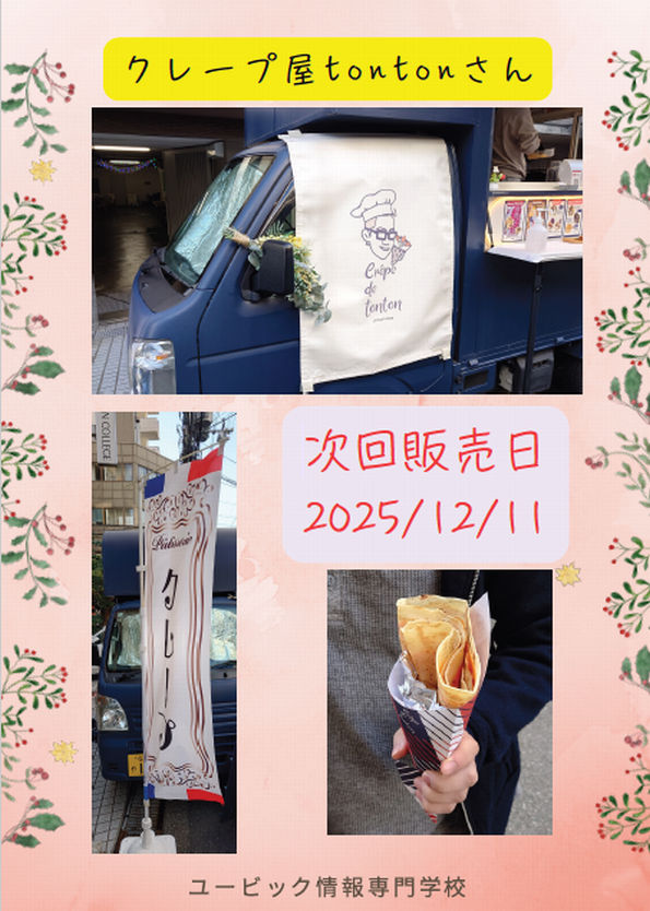 ユービック情報専門学校の校舎前では、ときどきキッチンカーの販売がありあます。 20205/11/20(木)はTonTonさんがやってきて、クレープの販売がありました。 通り沿いなので、一般の人も買いに来たりしますよ。 メ […]