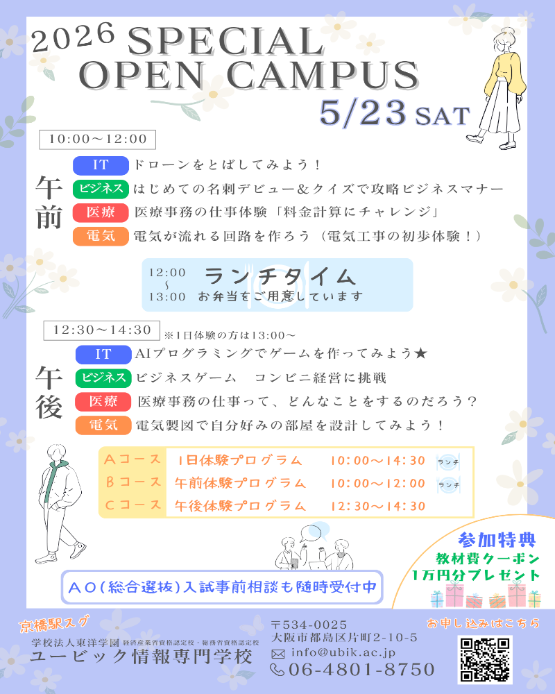 2026/3/22(日)に春の特別オープンキャンパスが開催されました。 午前のみ、午後のみ、午前・午後双方参加の合わせて10名の方が参加してくれました。 ユービック情報専門学校でも3/14に卒業生を送りだし、4月の新学期 […]