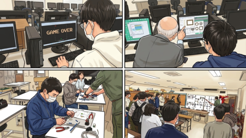 上段左側のコマは、ゲームプログラムの体験授業の様子、