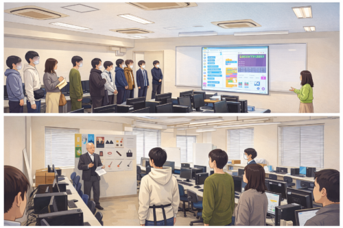 このイラスト画像と次の4コマ画像の右下最後の画像は、電気工事士コースの演習室の説明の様子です。